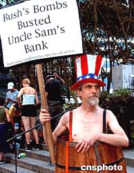 美國公民紐約街頭指責(zé)布什。一位抗議者把一只木桶套身上,舉著“布什的炸彈摧毀了山姆大叔的銀行”的抗議標(biāo)語,批判布什政府發(fā)動的反恐戰(zhàn)爭。當(dāng)日,共和黨大會正在紐約舉行,曼哈頓街頭隨處可見反對布什的標(biāo)語。作者:趙海燕