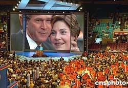 美東時間八月三十一日,美國第一夫人勞拉走上共和黨大會講臺,盛贊自己的丈夫給美國和世界帶來安全,身后的大屏幕播放著她和布什的合影。作者:趙海燕