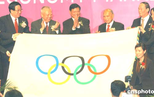 第八屆北京香港經濟合作研討洽談會暨奧運經濟市場推介會9月2日在香港會展中心開幕﹐北京市市委書記劉淇與市長王歧山﹑全國政協(xié)副主席霍英東﹑香港特首董建華﹑香港中聯(lián)辦主任高祀仁共同打開2008年在北京舉辦的第29屆奧林匹克運動會會旗。作者:趙振清