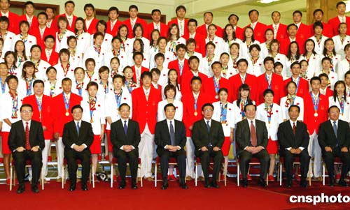 下午三時整,人民大會堂北大廳內(nèi)處處歡聲笑語。胡錦濤與吳邦國、溫家寶、曾慶紅、黃菊、吳官正、李長春、羅干等國家領(lǐng)導(dǎo)人親切會見了中國體育代表團(tuán)全體成員及隨團(tuán)采訪的新聞工作者代表,并與眾人合影留念。