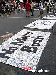 九月二日下午,在曼哈頓中城聯(lián)合廣場公園內(nèi),鋪著“把布什選下去”的標語,希望征集行人簽名。美國總統(tǒng)大選臨近,恰逢共和黨全國代表大會正在紐約舉行,民眾在市內(nèi)公園里舉行很多自發(fā)的反戰(zhàn)、反布什示威活動。作者:江雪晴