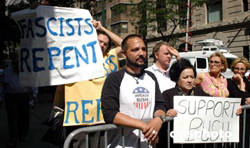 美東時間九月二日,美國總統(tǒng)布什來到紐約曼哈頓,準(zhǔn)備出席在這里舉行的共和黨全國代表大會閉幕式。當(dāng)總統(tǒng)車隊(duì)經(jīng)過被全線封鎖的市中心街道時,路邊一位婦人打著“支持布什”的標(biāo)語。但他身邊的男子展開更寬大的橫幅,上書“法西斯分子該悔悟了”。作者:龔文謨