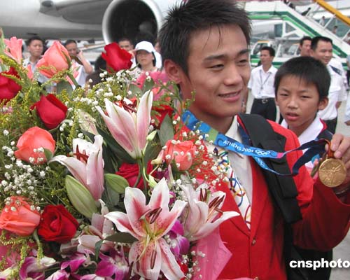 圖:奧運(yùn)冠軍胡佳返穗受到熱烈歡迎