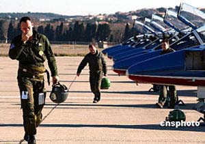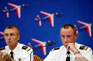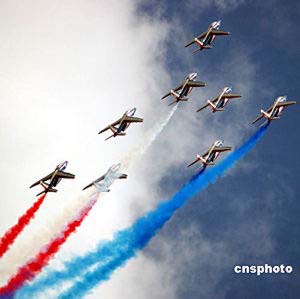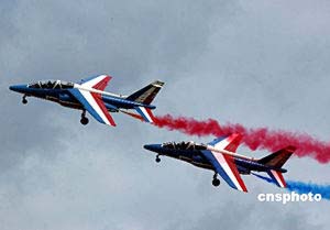 中新網(wǎng)9月7日電 日前,法國(guó)空軍飛行表演隊(duì)先遣組組長(zhǎng)讓·馬克在北京透露,“法蘭西巡邏兵”飛行表演隊(duì)10月將隨希拉克總統(tǒng)到訪北京,在北京南苑機(jī)場(chǎng)舉行兩場(chǎng)表演,然后赴武漢、珠海、香港巡演。法蘭西巡邏兵是世界五大特級(jí)飛行隊(duì)之一,此次隨總統(tǒng)出訪是第一次。表演隊(duì)使用阿爾法噴氣教練機(jī)。此次表演由國(guó)防部外事辦公室和空軍有關(guān)單位主辦。中新社記者:鄭萍萍