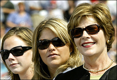 中新網(wǎng)9月5日電 據(jù)法新社報(bào)道,美國總統(tǒng)布什的家人,他的兩個(gè)雙胞胎女兒芭芭拉(左)、簡娜(中)以及妻子勞拉在布什在賓夕法尼亞州一個(gè)老兵紀(jì)念館里面對觀眾演講時(shí)在一旁為他助威。(固山)