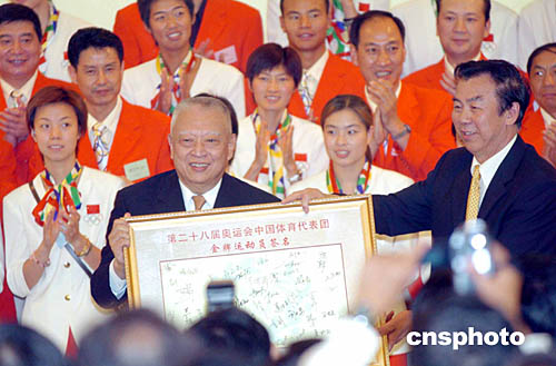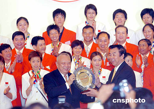 9月6日,香港特區(qū)行政長官董建華在禮賓府舉行盛大歡迎酒會上,向中國奧運金牌選手訪港團贈送“中國人的驕傲”禮物。
