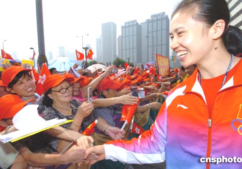 國家奧運金牌代表團9月7日在香港展開觀光之旅,9時45分抵達灣仔金紫荊廣場參觀,吸引大批市民圍觀,圖為女排選手周蘇紅為熱情的香港市民簽名。作者:趙振清