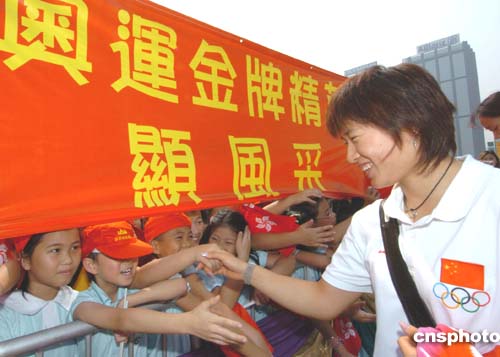 代表團(tuán)首先在金紫荊雕像前來個大合照,然后繞場一周,一一與在場市民握手和簽名,他們所經(jīng)之處,均引起一陣哄動,在場工作人員不停呼吁地市民注意安全和保持秩序。在烈日下,有“靚女”之稱的女排姑娘周蘇紅、劉亞男把手都簽酸了,仍滿足不了熱情的球迷。代表團(tuán)逗留了約半小時,在市民歡送聲中離開,繼續(xù)其他參觀訪問。