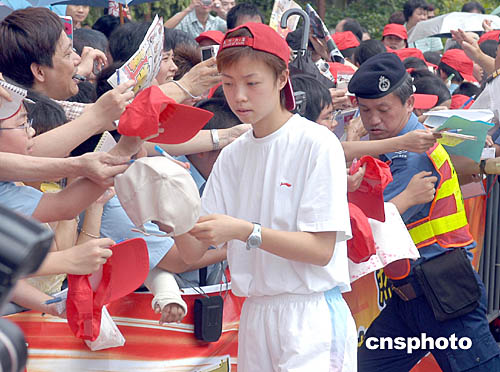 今天一共有逾三千名市民到場圍觀,他們包括中小學(xué)生以及老人家,他們不停地?fù)]動著手上的旗幟,有市民自制了歡迎的字句標(biāo)語,不停地喊叫心中崇拜的運動員的名字。