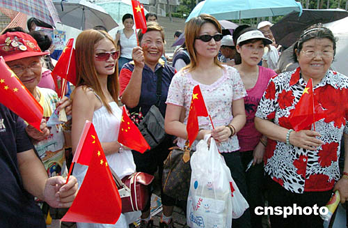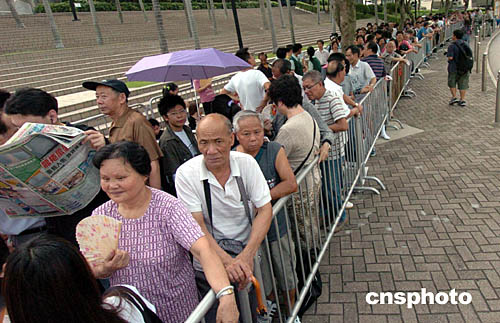 由五十位中國奧運(yùn)金牌選手和香港當(dāng)紅藝人聯(lián)袂奉獻(xiàn)的大匯演定于晚間七點(diǎn)正式開始,但不到下午三點(diǎn),匯演地點(diǎn)大球場外已經(jīng)有超過二百名香港市民冒酷暑、頂烈日在排隊(duì)“霸位”。他們個(gè)個(gè)“裝備齊全”,帶了水、遮陽傘和面包點(diǎn)心,說起來看奧運(yùn)健兒表演,都有掩飾不住的喜悅與興奮之情。