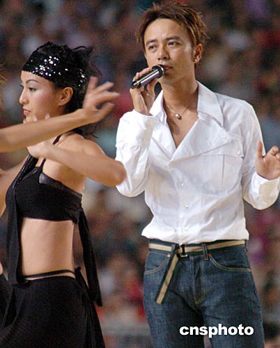 為歡迎國家奧運(yùn)金牌代表團(tuán)訪港,九月七日香港舉行“金牌精英大匯演”,香港歌星李克勤在“金牌精英大匯演”上演唱。中新社記者:錢興強(qiáng)