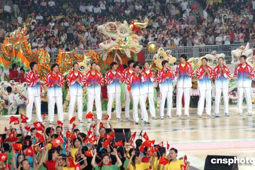 9月7日晚上,位于快活谷的香港大球場(chǎng)成為名副其實(shí)的“歡樂之谷”,國(guó)家奧運(yùn)金牌選手和數(shù)萬名香港市民會(huì)聚在此,共享中國(guó)在雅典奧運(yùn)會(huì)奪金的喜悅和榮光!皧W運(yùn)精英大匯演”在這里拉開帷幕。圖為女排教練陳忠和帶領(lǐng)全體選手高歌,為晚會(huì)推向高潮。作者:洪少葵