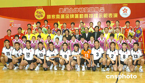 中國(guó)女子排球隊(duì)8日來(lái)到香港修頓體育館進(jìn)行表演﹐與香港男女排球隊(duì)合影留念。中新社記者:趙振清