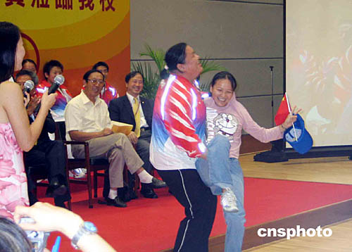 十多名中國(guó)奧運(yùn)金牌運(yùn)動(dòng)員8日到香港中文大學(xué)訪問(wèn),七百多名師生出席歡迎活動(dòng)。期間有學(xué)生要求女子75公斤舉重金牌得主唐功紅抱起她,引來(lái)全場(chǎng)哄動(dòng)。作者:尹丹丹