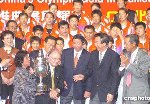 馬會搭設(shè)的頒獎臺上,寫有“0四雅典盡創(chuàng)輝煌,0八北京再顯鋒芒”的字樣,表達(dá)了馬會的愿望。代表團(tuán)團(tuán)長、國家體育總局局長袁偉民頒發(fā)了獎杯,而全體金牌運(yùn)動員則登上頒獎臺,列席頒獎儀式。在此之前,全體金牌運(yùn)動員還在一匹駿馬雕塑上簽名留念。