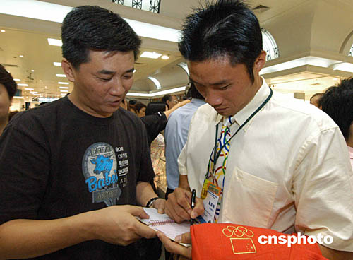 中國雅典奧運金牌選手代表團九日抵達澳門訪問,當天下午部分選手到商埸輕松購物,金牌選手孟關(guān)良在商埸熱情?澳門市民簽名。作者:梁永強