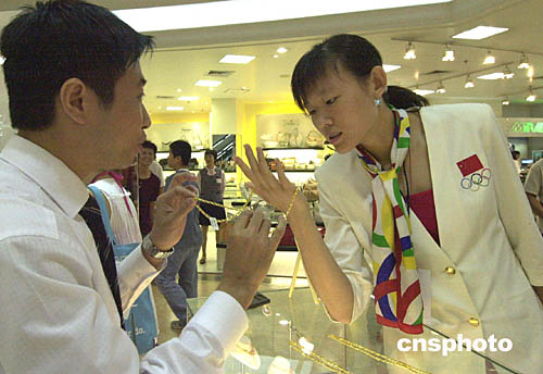 中國(guó)雅典奧運(yùn)金牌選手代表團(tuán)九日抵達(dá)澳門訪問,當(dāng)天下午部分選手到商場(chǎng)購(gòu)物,跆拳道金牌選手羅微在選購(gòu)金飾。作者:梁永強(qiáng)