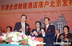 澳門勵(lì)駿創(chuàng)建有限公司與北京華麗金寶房地產(chǎn)開發(fā)有限公司攜手,在北京金寶街興建星級(jí)豪華酒店——勵(lì)駿酒店簽約儀式九月十日舉行。該酒店緊鄰?fù)醺虡I(yè)區(qū),設(shè)計(jì)水平超前,預(yù)計(jì)2007年底建成投入使用。京澳雙方在北京首都合資興建星級(jí)勵(lì)駿酒店,這在北京尚屬首例。中新社記者:張宇