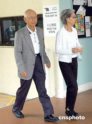 香港電影大亨、嘉禾電影公司主席鄒文懷9月12日到山頂僑福道投票站投票。圖為鄒文懷等投票后步出投票站。作者:鄧慶樂(lè)
