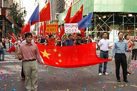華僑華人和留學生組成了本次游行中人數(shù)最多、聲勢最浩大的隊伍,不但有舞龍、舞獅、鑼鼓,還有腰鼓、秧歌以及表現(xiàn)中國京劇藝術、少數(shù)民族服裝等傳統(tǒng)文化的表演分隊,許多路邊的觀眾也揮動中國國旗并熱烈鼓掌。