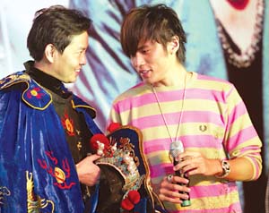 慶功會以京劇《大鬧天宮》開場,各路天王把周杰倫簇?fù)碓谥醒,隱喻“唯周杰倫獨(dú)尊”。隨后,川劇大師彭登懷的弟子上臺伴著《我的地盤》表演了變臉。站在臺側(cè)的周杰倫目不轉(zhuǎn)睛地盯著表演者,然后走到表演者身邊左看右看,最后干脆動手搜起身來。聽到觀眾的笑聲,周杰倫很不好意思地說:“等回家再把老師扒光了查。”