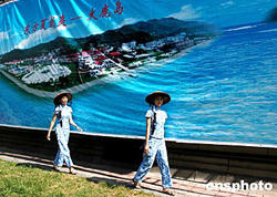 九月遼寧丹東街頭,兩位漁民裝束的女子走過(guò)“大鹿島--東方夏威夷”的巨幅掛圖。遼寧省丹東市最大的島嶼大鹿島不僅是該地區(qū)最大的活貝出口集散地,其長(zhǎng)灘、細(xì)沙、緩坡等自然條件和甲午海戰(zhàn)等歷史遺跡形成避暑觀光的旅游勝地,當(dāng)?shù)卣畵?jù)此優(yōu)越條件大力招商引資準(zhǔn)備進(jìn)行大鹿島的整體開(kāi)發(fā)。中新社記者:王麗南