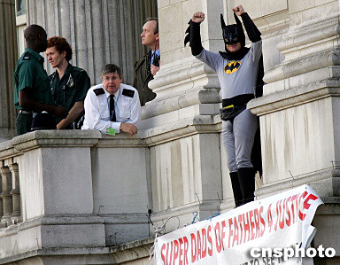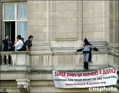 這名抗議者詹森·哈奇,今年32歲,是英國維護父權(quán)組織“為父親討公道(Fathers 4 Justice)”的一名成員,他扮成蝙蝠俠模樣,闖入女王伊麗莎白二世居住的白金漢宮,爬上宮殿正面一個陽臺,又從陽臺走到危險的墻檐上,引來大群圍觀者。大為尷尬的白金漢宮安全官員當(dāng)天晚上即對此事展開調(diào)查。
