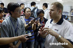九月十四日在北京網(wǎng)球中心的新聞中心內(nèi),ATP官員Iggy(右)乘網(wǎng)球比賽因雨暫停的機(jī)會回答記者提問。
