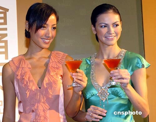 香港名模蔣怡(左)﹑Rosemary14日出席香港時代廣場“時代b2”開業(yè)儀式。