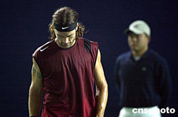 中國(guó)網(wǎng)球公開賽男單比賽九月十五日晚在北京網(wǎng)球中心中央球場(chǎng)繼續(xù)進(jìn)行,賽會(huì)頭號(hào)種子西班牙名將莫亞以零比二不敵法國(guó)選手特松加,爆出本屆中國(guó)網(wǎng)球公開賽最大冷門,無(wú)緣晉級(jí)下一輪。中新社記者:盛佳鵬