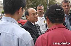 這是示威者向日本外交官(中)轉(zhuǎn)交致日本政府的抗議信。作者:余東暉
