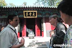 | 九月二十一日,導(dǎo)游在剛剛竣工的少林寺立雪亭前給游客講解。中國嵩山少林寺整修工程近日竣工,過去僅能容納三千多人的少林寺整修后可同時(shí)接納一萬人游覽。今年三月份,鄭州市政府開始全面對(duì)少林寺進(jìn)行整修。整修內(nèi)容除包括擴(kuò)建青石廣場(chǎng),寺院內(nèi)地面磚、消防通道等建設(shè)外,還恢復(fù)東西八座殿堂的歷史原貌以及殿宇樓閣的重新粉飾添彩等多項(xiàng)工程。這次少林寺整修工程共鋪設(shè)青磚地面近一萬平方米,恢復(fù)建筑面積一千六百平方米,新建東僧房建筑面積近一千五百平方米。作者:慎重