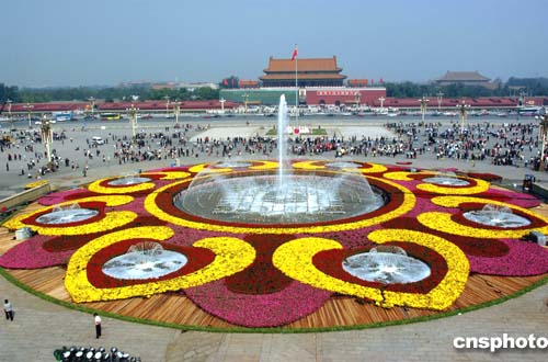 九月二十三日,北京市園林局在天安門(mén)廣場(chǎng)中央搭建的直徑72米的“萬(wàn)眾一心”巨型噴泉花壇竣工。天安門(mén)廣場(chǎng)花壇總占地面積為12000平方米,用花總量約為30余萬(wàn)盆。中新社記者:鄒憲