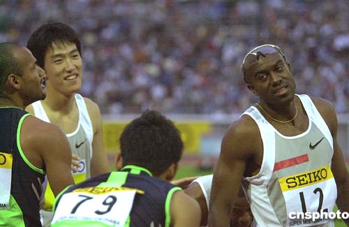 | 劉翔在二十三日傍晚于日本橫濱國際體育場進(jìn)行的國際田聯(lián)全明星賽男子一百一十米欄比賽中疲憊出戰(zhàn),仍然輕松地將他的前輩老對手阿蘭·約翰遜拋到身后,令賽前揚(yáng)言要破紀(jì)錄并戰(zhàn)勝劉翔的約翰遜無話可說。圖為兩位新老名將沖線后都是一臉笑容,但顯然,劉翔笑得愉快,約翰遜笑得無奈。中新社記者:王健
