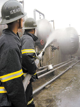 成都市消防支隊緊急調(diào)集城區(qū)10個中隊共40輛消防車趕往現(xiàn)場,并立即啟動“104油庫應急預案”。幾分鐘之后,油庫周圍的居民全部撤離,接著便看見鳴著警笛的消防車接連不斷地開進了油庫。