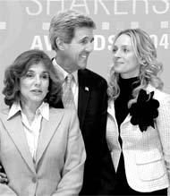 日前,她出席了紐約一個(gè)名為第七屆全年“RedbookMothersand-Shakers”大獎(jiǎng),接受大會(huì)頒贈(zèng)的獎(jiǎng)項(xiàng)。同一場(chǎng)合,與現(xiàn)任美國(guó)總統(tǒng)布什競(jìng)逐下任美國(guó)總統(tǒng)的克里(圖中)也有出席,還與這位巨星一同合照。(鐵巖)