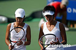 九月二十五日,中國(guó)網(wǎng)球公開(kāi)賽女子雙打比賽繼續(xù)在北京網(wǎng)球中心進(jìn)行,在中央球場(chǎng)進(jìn)行的女雙半決賽中,中國(guó)選手、雅典奧運(yùn)會(huì)起網(wǎng)球女雙冠軍李婷和孫甜甜(后)不敵俄羅斯選手薩芬娜與瑞士選手加格里亞蒂組合,無(wú)緣晉級(jí)決賽。中新社記者:盛佳鵬