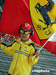 九月二十五日,F(xiàn)1中國站排位賽在上海國際賽車場舉行,吸引數(shù)十萬中外車迷。圖為上海小車迷將F1紀念品全副武裝到位。作者:潘索菲