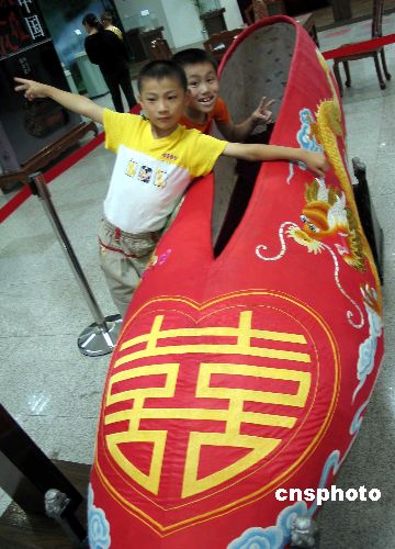 | 江蘇鎮(zhèn)江市的兩名兒童與一只世界最大的繡花鞋合影。據(jù)介紹,這只在當(dāng)?shù)厣虡I(yè)城展出的繡花鞋全長2.8米,寬0.87米,高0.71米,重達(dá)63公斤,鞋內(nèi)可躺臥兩至三人,是由溫州7名著名手工藝專家用半年多時間精心制作而成,共耗去1公斤多真絲彩線,五匹布,及100多公斤有關(guān)材料。鞋面繡有大大的雙喜字、兩側(cè)繡有龍鳳圖案,繡面光亮,紋理分明,色彩鮮艷。作者:陳崗