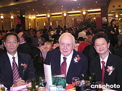 澳大利亞新南威爾士州華人華僑當(dāng)?shù)貢r(shí)間9月26日舉行盛大聯(lián)歡晚會(huì),熱烈慶祝中華人民共和國(guó)成立五十五周年和中國(guó)的傳統(tǒng)節(jié)日中秋節(jié)。中國(guó)駐澳大使的代表曹東昌(右)、中國(guó)新任駐悉尼總領(lǐng)事邱紹芳(左)、澳大利亞前總理惠特拉姆(中)以及新州各界人士600多人歡聚一堂。作者:劉雨生