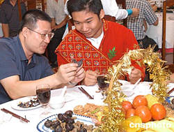 九月二十七日晚,來(lái)自近三十個(gè)國(guó)家和地區(qū)的一百多名華裔留學(xué)生聚集在廣州荔灣湖畔的泮溪酒家,參加廣東省僑辦舉辦的中秋聯(lián)誼會(huì),品嘗有名的“廣州泮塘五秀”——菱角、馬蹄、蓮藕、茨菰、茭筍。圖為華裔留學(xué)生在學(xué)習(xí)食用方法。作者:羅仰明