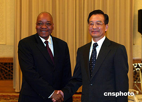 溫家寶表示,中國(guó)高度重視與南非的關(guān)系,希望兩國(guó)戰(zhàn)略伙伴關(guān)系不斷發(fā)展。溫家寶說,最近,南非承認(rèn)中國(guó)的市場(chǎng)經(jīng)濟(jì)地位,與中國(guó)共同宣布啟動(dòng)中國(guó)與南部非洲關(guān)稅同盟自由貿(mào)易區(qū)談判,為雙邊經(jīng)貿(mào)合作創(chuàng)造了更加有利的條件。雙方應(yīng)抓住機(jī)遇,推動(dòng)經(jīng)貿(mào)合作進(jìn)一步發(fā)展。