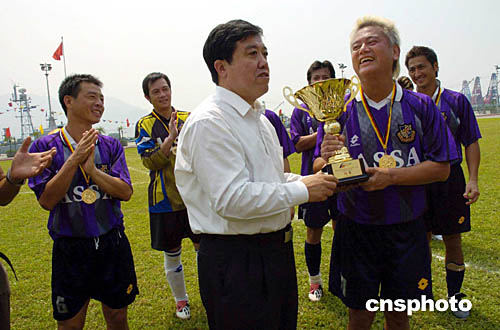 圖為外交部駐港特派員楊文昌向明星隊(duì)頒發(fā)冠軍獎(jiǎng)杯。