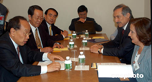 當地時間九月二十七日,出席第五十九屆聯大的中國外長李肇星(左)在紐約聯合國總部會見了智利外長索萊達·阿爾韋亞爾(右)。作者:趙海燕