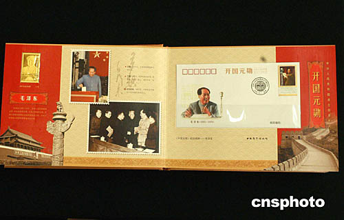 在慶祝中華人民共和國(guó)成立五十五周年之際,毛澤東的女兒李敏(左二)及孔繼寧(李敏之子)(左三)、孔東梅(李敏之女)(左一),九月二十九日以開(kāi)國(guó)元?jiǎng)子H屬和嘉賓身份,在北京人民大會(huì)堂出席《開(kāi)國(guó)元?jiǎng)住方疸y郵品典藏冊(cè)首發(fā)式和新聞發(fā)布會(huì),并一起欣賞這部由中國(guó)郵票博物館出版發(fā)行的典藏冊(cè)。