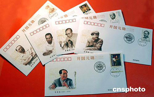 | 在慶祝中華人民共和國成立五十五周年之際,中國郵票博物館九月二十九日出品發(fā)行了一套十五枚《開國元勛》絹質(zhì)紀念封。《開國元勛》絹質(zhì)紀念封其中印有毛澤東、周恩來、劉少奇、朱德、任弼時、鄧小平、陳云、彭德懷、劉伯承、賀龍、陳毅、羅榮桓、徐向前、聶榮臻、葉劍英等開國元勛的生活圖象和貼有相應肖像郵票。這套絹質(zhì)紀念封也被收納在中國郵票博物館于當日發(fā)行的《開國元勛》金銀郵品典藏冊之中。中新社記者:鄒憲