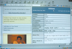 在這個(gè)名為“Friendster”的征友網(wǎng)站上,陳冠希用自己英文名“Edison”征友,在網(wǎng)上不僅有他詳細(xì)的資料,還有他6張生活照片,從照片的拍攝角度來看,應(yīng)該是陳冠希用網(wǎng)絡(luò)攝像機(jī)自己拍攝的,一向搞怪的陳冠希在網(wǎng)絡(luò)世界也不愿放棄作秀機(jī)會(huì),6張照片既有成熟穩(wěn)重的模樣,也有扮猩猩、吐舌頭的怪相,甚至有陳冠希向網(wǎng)友送上香吻的照片,極為搞笑。