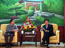 湖南省副省長賀同新(右)九月三十日在長沙會見全國政協(xié)委員、香港興業(yè)集團(tuán)董事會副主席查懋聲一行。查懋聲來湘是為了考察湖南株洲市一個總投資額近七億元的房地產(chǎn)項(xiàng)目。作者:鄧霞