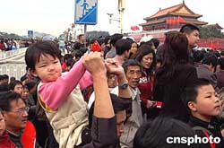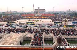 十月二日的國(guó)慶節(jié)假日,天安門廣場(chǎng)向北京市民來賓開放,數(shù)十萬游人,紛至沓來,從各個(gè)通道擁進(jìn)廣場(chǎng)觀光,形成節(jié)日人山人海的景觀。作者:鄒憲