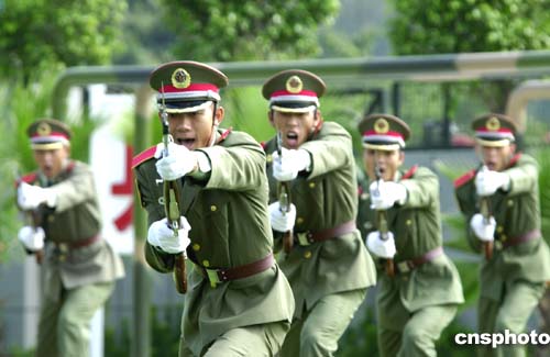 上午,當(dāng)澳門特別行政區(qū)行政長官何厚鏵、澳門中聯(lián)辦主任白志健和多位特區(qū)政府官員及社會各界人士進(jìn)入營區(qū)時(shí),受到駐澳門部隊(duì)司令員劉聯(lián)華少將、政治委員楊忠民少將等駐軍官兵熱烈歡迎,特首與市民興致勃勃觀看了升國旗儀式、儀仗隊(duì)隊(duì)列操槍、刺殺團(tuán)體操、裝甲車縱隊(duì)行進(jìn)等軍事科目表演,官兵精湛的軍事技術(shù)、良好的精神風(fēng)貌,贏得了澳門市民的陣陣掌聲。